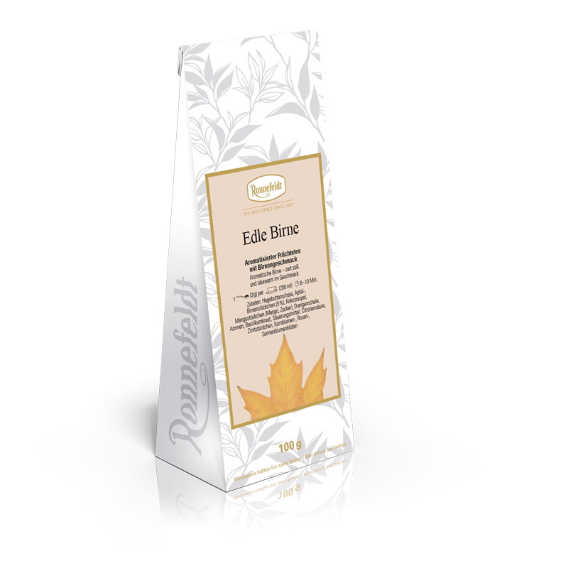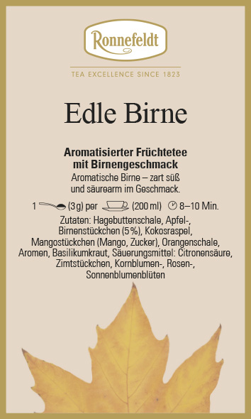 Aromatische Birne – zart süß und säurearm im Geschmack. Dieser Tee ist als „besonders mild“ gekennzeichnet, da er keinen Hibiskus enthält.