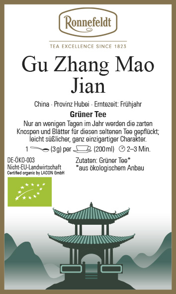 Die Tang-Dynastie war eine chinesische Kaiserdynastie, die von 618 bis 907 an der Macht war. Die Zeit der Tang-Kaiser gilt in der historischen Forschung als ein Höhepunkt der chinesischen Geschichte. Der Tee stammt aus der Provinz Hubei im Landkreis Guzhang. Daher kommt auch der Name dieses einzigartigen Tees. In der Region, in der die Teepflanzen wachsen, löst die Sonne erst spät den Frühnebel auf. Die Feuchtigkeit hält sich lange auf den Blättern, und diese Nebelfeuchte prägt den feinen Geschmack des außergewöhnlichen Tees, der nur an zehn Tagen im Frühjahr geerntet wird. Ausschließlich die ersten und zweiten Blätter der jungen Triebe werden von Hand gepflückt und anschließend weiter verarbeitet.