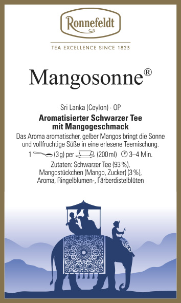 Aromatisierter Schwarzer Tee mit Mangogeschmack. Das Aroma aromatischer, gelber Mangos bringt die Sonne und vollfruchtige Süße in eine erlesene Teemischung.