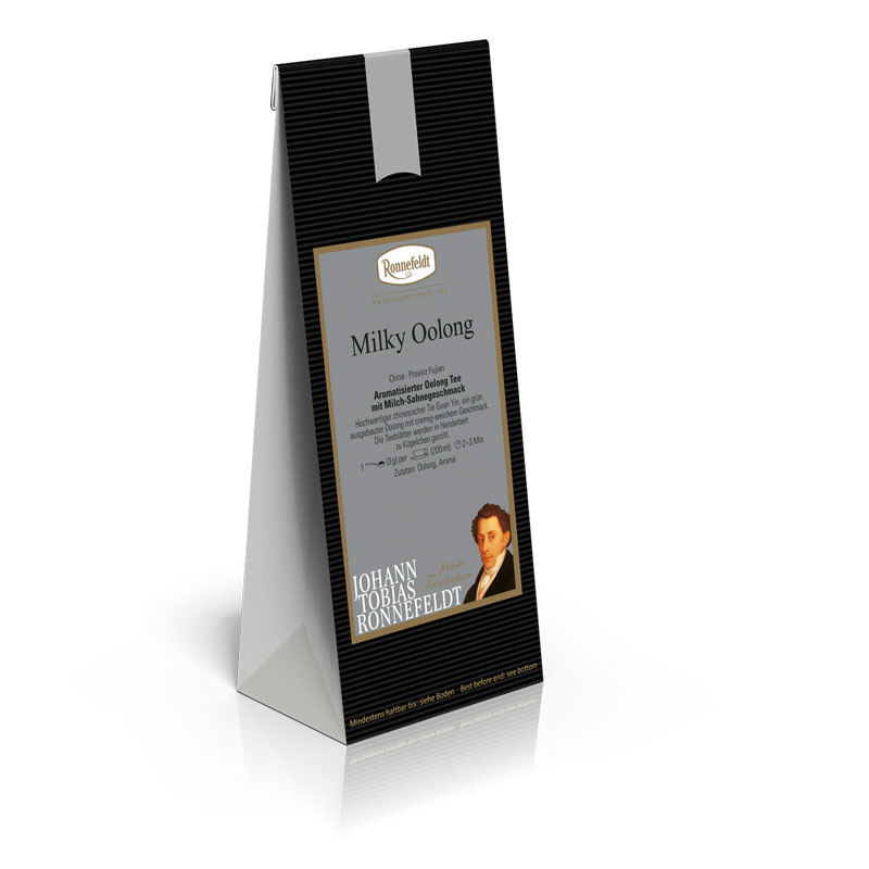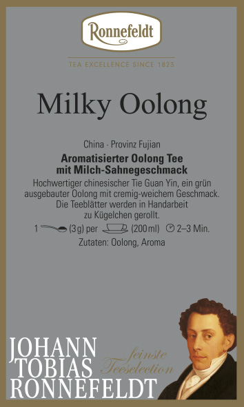 Aromatisierter Oolong Tee mit Milch-Sahnegeschmack. Hochwertiger chinesischer Tie Guan Yin, ein grün ausgebauter Oolong mit cremig-weichem Geschmack. Die Teeblätter werden in Handarbeit zu Kügelchen gerollt.