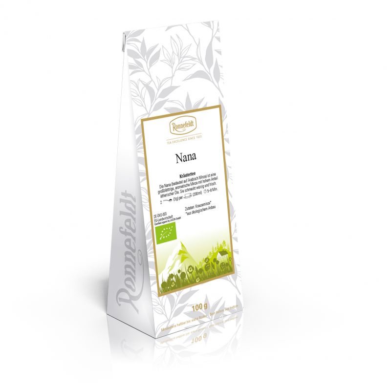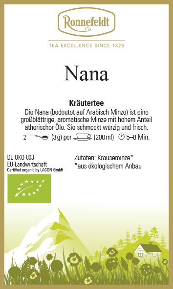 Die Nana (bedeutet auf Arabisch Minze) ist eine großblättrige, aromatische Minze mit hohem Anteil ätherischer Öle. Sie schmeckt würzig und frisch.