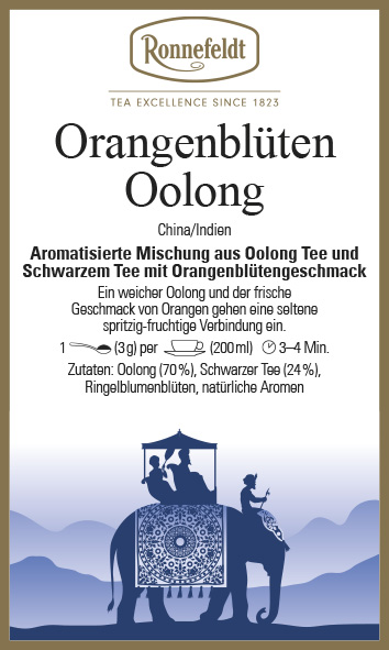 Aromatisierte Mischung aus Oolong Tee und schwarzem Tee mit Orangengeschmack Ein weicher Oolong und der frische Geschmack von Orangen und Blüten gehen eine seltene spritzig-fruchtige Verbindung ein.