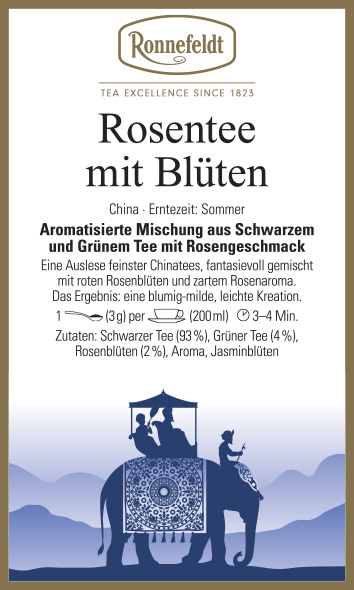 Zutaten: Schwarzer Tee (93 %), Grüner Tee (4 %), Rosenblüten (2 %), Aroma, Jasminblüten