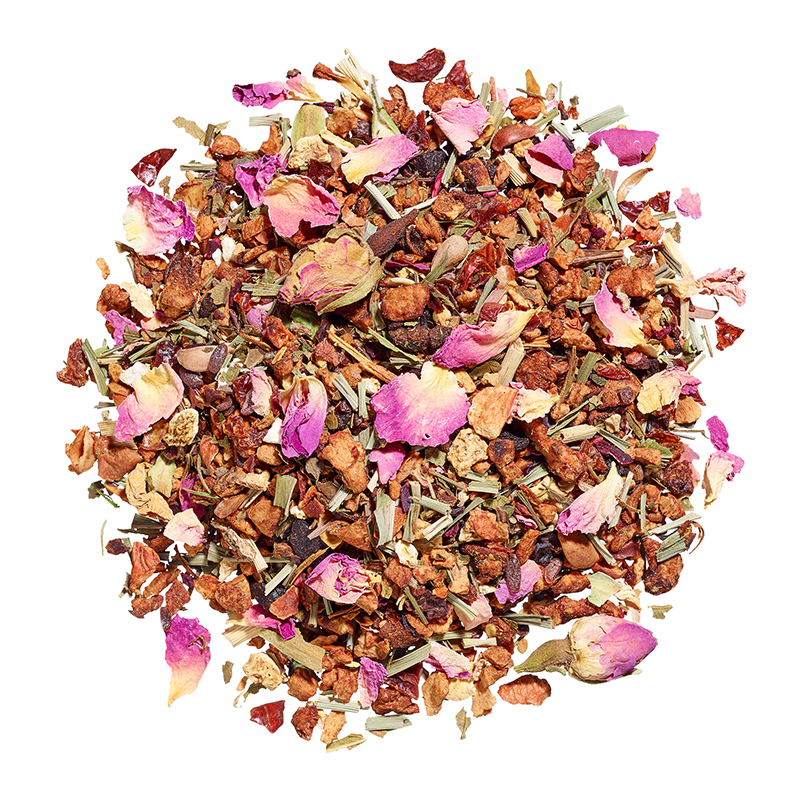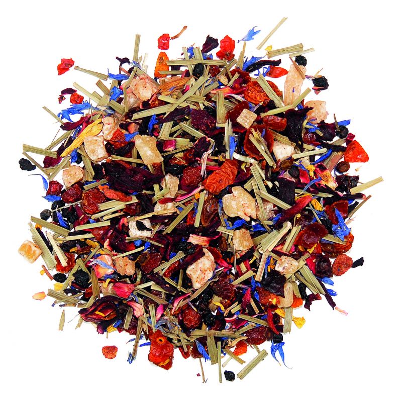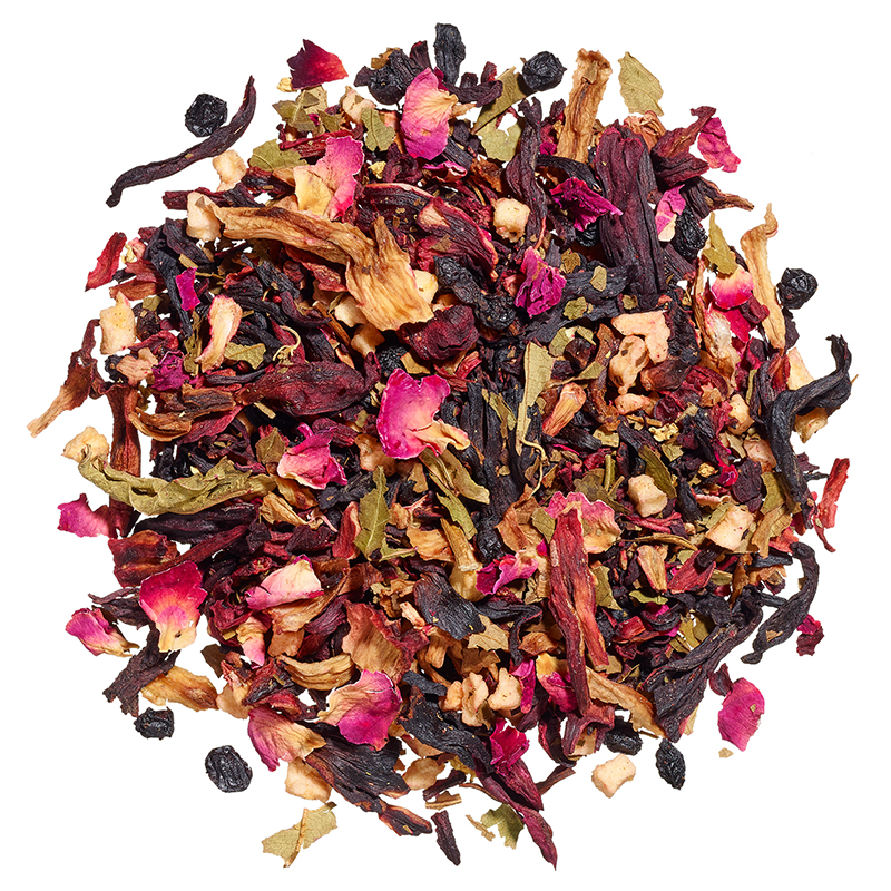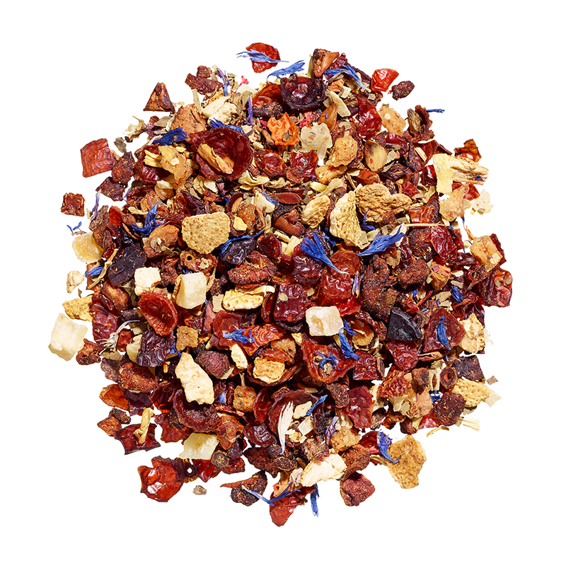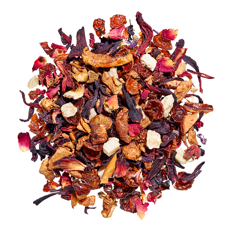 Apfelstückchen, Hibiskus, Hagebuttenschale, Ananasstückchen (Ananas, Zucker), Orangenschale, Rosenblüten