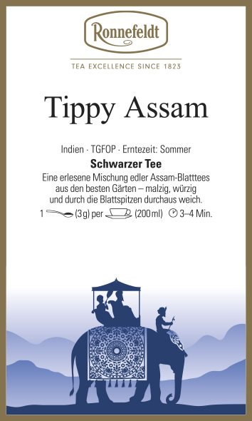Eine erlesene Mischung edler Assam-Blatttees aus den besten Gärten – malzig, würzig und durch die Blattspitzen durchaus weich.