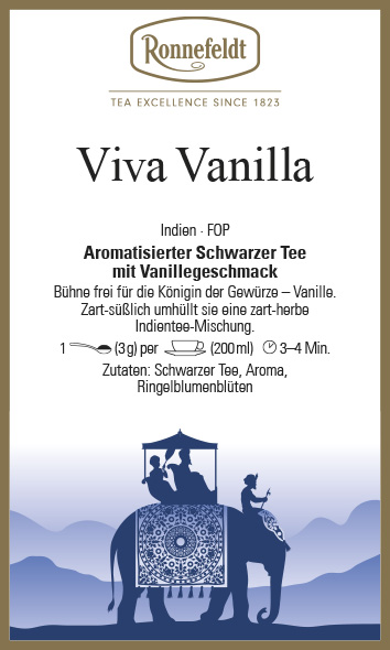Aromatisierter Schwarzer Tee mit Vanillegeschmack.   Bühne frei für die Königin der Gewürze – Vanille. Zart-süßlich umhüllt sie eine zart-herbe Indientee-Mischung.